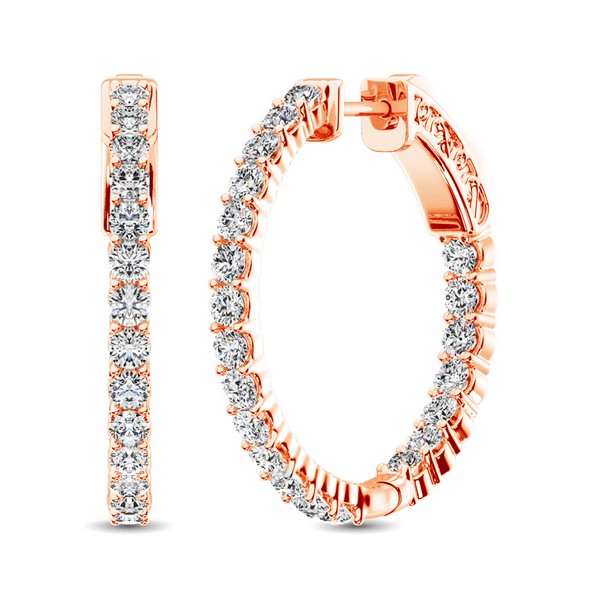 These stunning earrings are available in 14K Rose Gold. There are 21 round diamonds with a total carat weight of 2 ct set in a Prong setting.