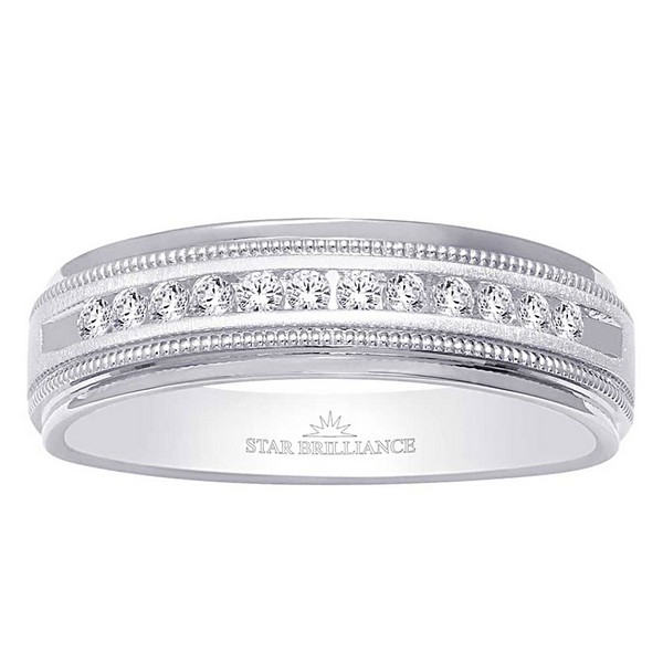 This eye-catching Mens Machine Band is available in 14K White Gold. There are 12 round diamonds with a total carat weight of 1 ct set in a machine setting setting.