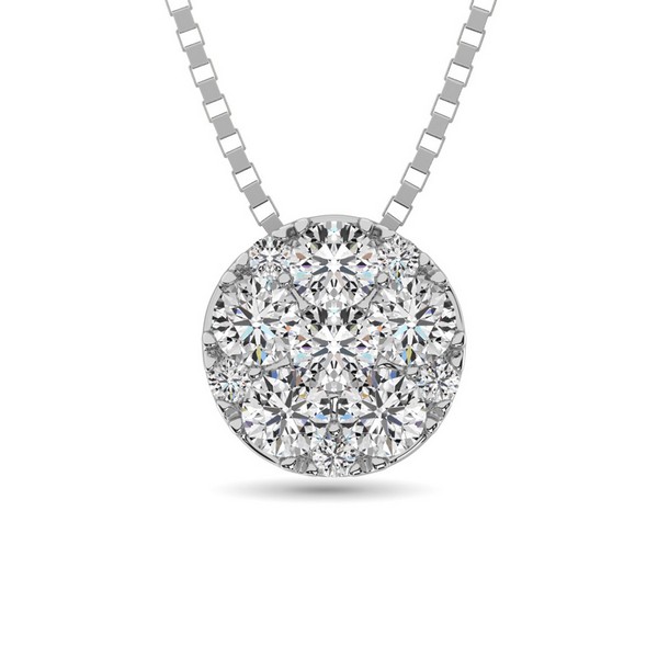 This beautiful circular shape pedant cover with 11 round cut diamonds of 1/2 ctw in invisible and micro prong setting, which gives Big solitaire LOOK!!! The Pendant Suspended With 18 Inch Cable Chain that Secures With a Spring-Ring Clasp.