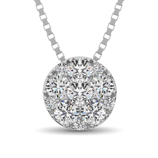 This beautiful circular shape 14K White Gold cover with 11 round cut diamonds of 1/4 ctw in invisible and micro prong setting, which gives Big solitaire LOOK!!! The Pendant Suspended With 18 Inch Cable Chain that Secures With a Spring-Ring Clasp.