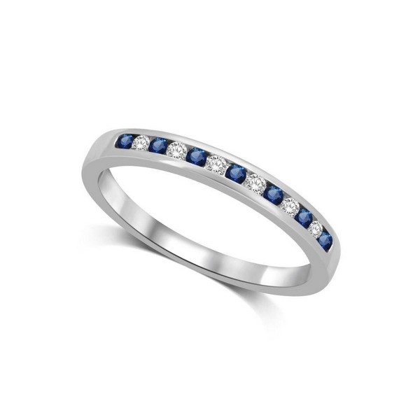 14K White Gold Machine Band Set with 7 round cut 1/5 Ctw Blue Sapphires and 6 diamonds in channel setting.