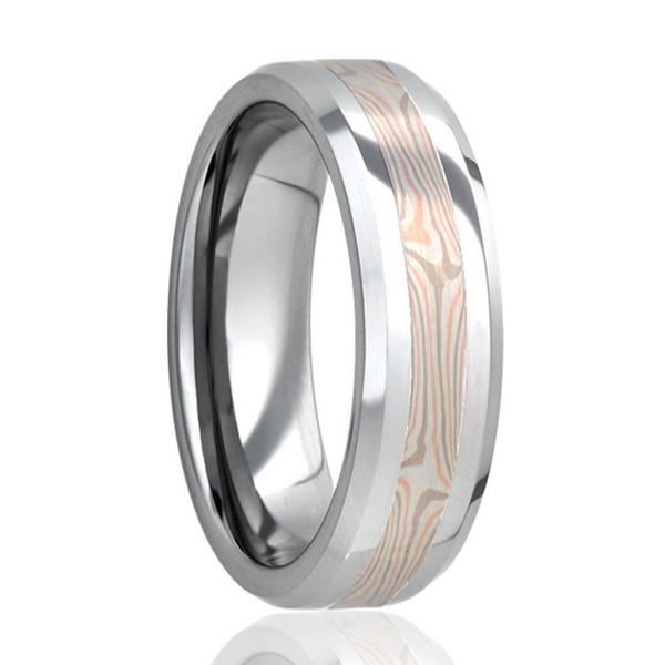 Tungsten ring with a white gold, rose gold and silver mokume gane inlay