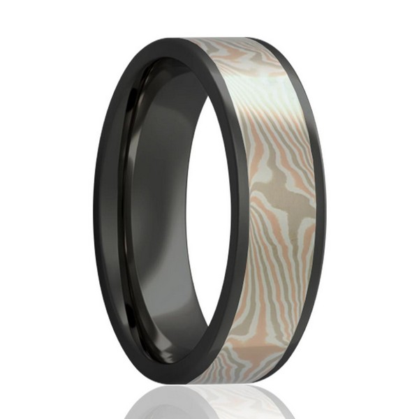 Zirconium ring with a rose gold, white gold and silver mokume gane inlay