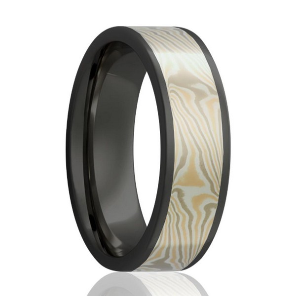 Zirconium ring with a yellow gold, white gold and silver mokume gane inlay