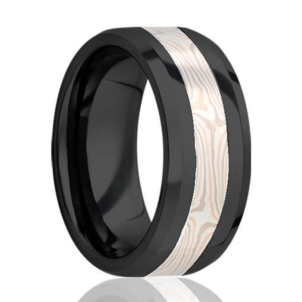 Zirconium ring with rose gold and white gold mokume gane inlay